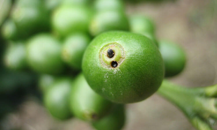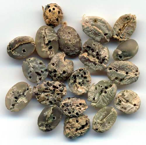 Este insecto (específicamente la hembra) taladra el fruto del cafeto. Por lo general en la corola u ombligo, aunque también lo puede hacer por un lado; hasta llegar al endosperma del fruto para construir una serie de galerías en las que dos días después pondrá entre 35 y 50 huevos. Para que se de este proceso es necesario que el endosperma esté en estado sólido, por lo que si el fruto al ser atacado aun tiene un endosperma líquido e inmaduro, la broca se queda en el mesodermo esperando varias semanas hasta que madure; lo que podría significar incluso, su propia muerte (antes de causar daño real al fruto).